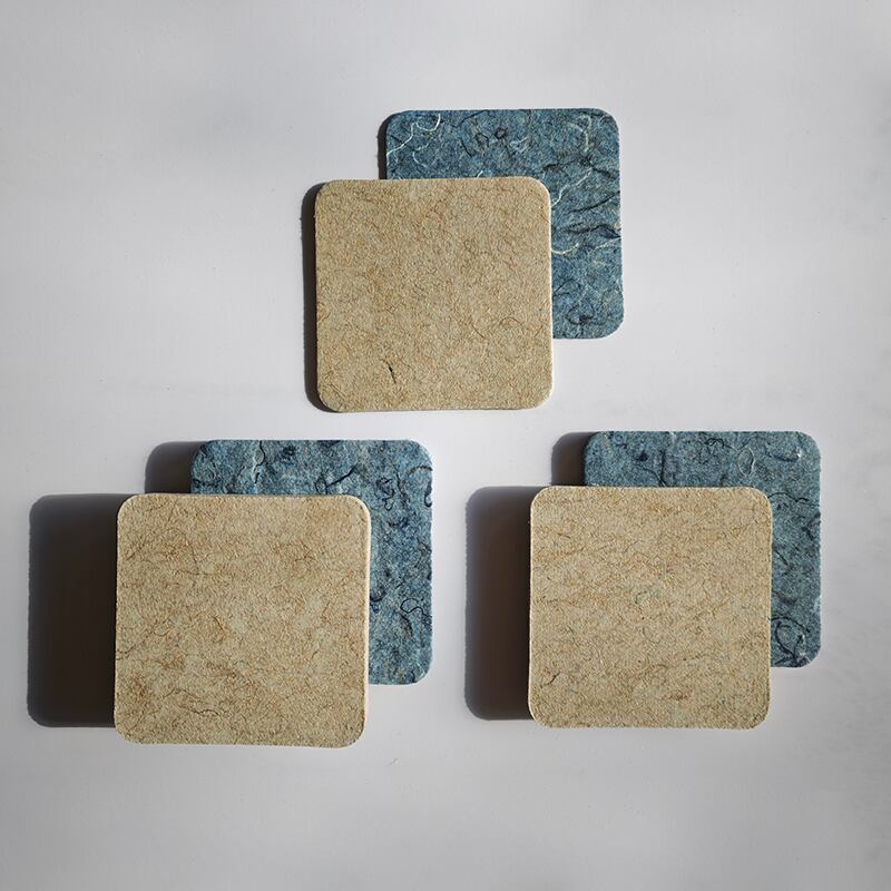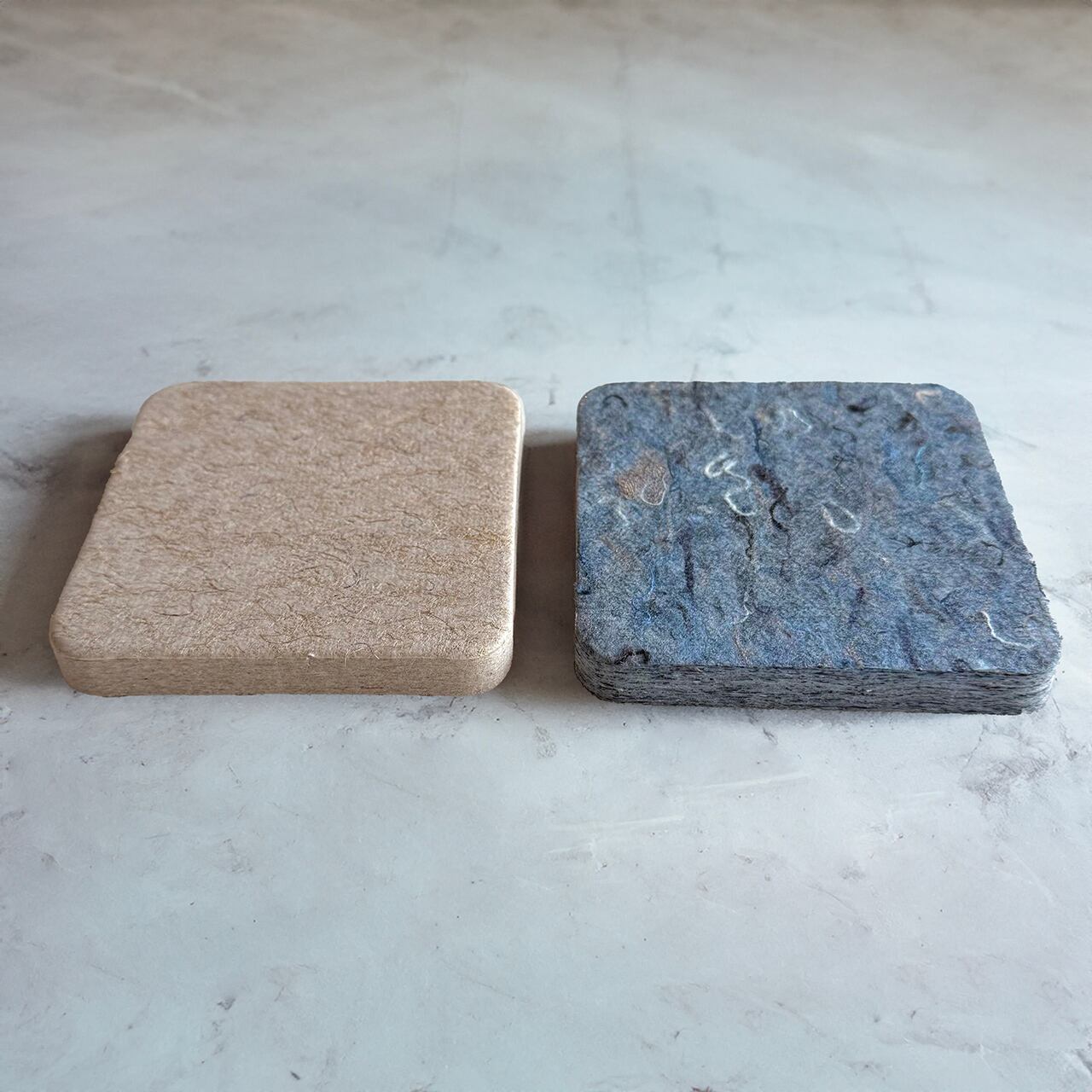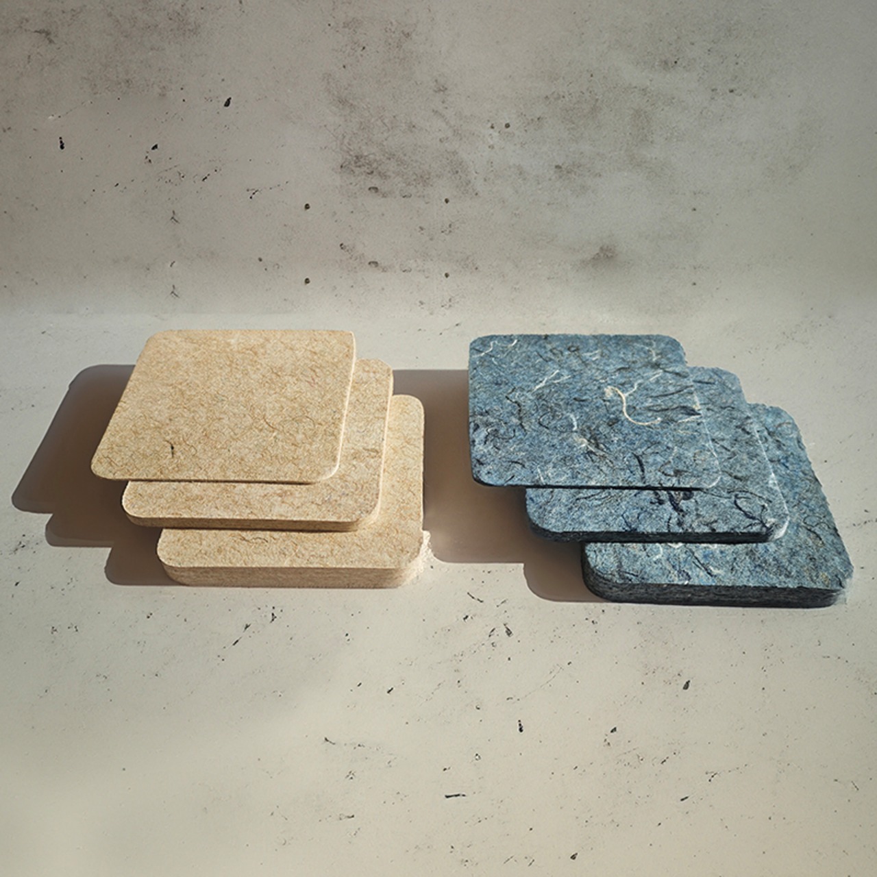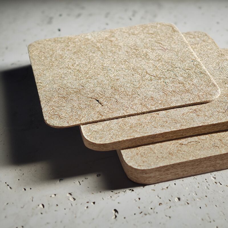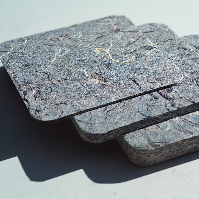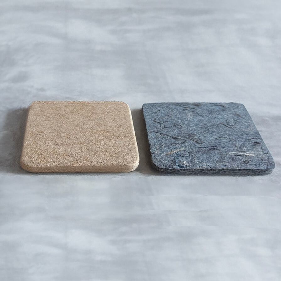 GREEN FLAGが販売する【Rebornfiber®】の規格材ラインナップをまとめてご確認いただけるカットサンプルの6枚セットです。厚み別に1mm厚、5mm厚、10mm厚の3種類を比較でき、デニム端材が原料のRDと、コーヒー豆の麻袋が原料のRH、それぞれの硬さと風合いの違いをお確かめいただけます。